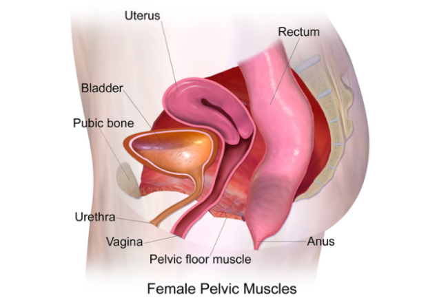 The pelvic floor consists of a layer of muscles stretching from your pubic bone at the front, to your tailbone at the back.